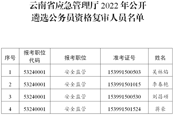 附件:云南省應急管理廳2022年公開遴選公務員資格復審人員名單